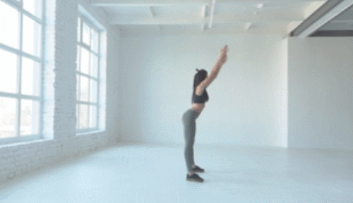 바닥에 서서 시작합니다. 손을 머리 위로 올리고, 상체를 앞으로 숙여주세요. 그리고 무릎을 구부리고, 스쿼트 동작을 진행합니다. 그런 다음 손을 머리 위로 올리고, 원래 자세로 돌아옵니다. 1분 동안 스쿼트 변형 동작을 반복하세요.