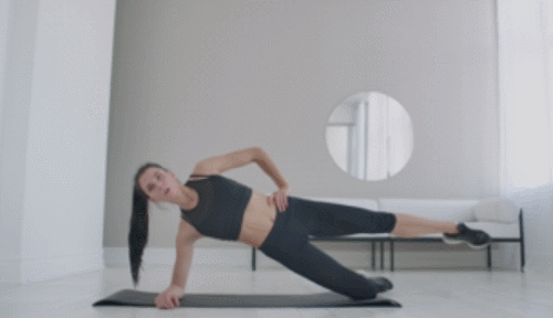 오른쪽 팔뚝을 대고 옆으로 누워서 시작하세요. 오른쪽 무릎을 바닥에 대고, 왼쪽 다리를 공중으로 들었다가 내리는 동작을 30초 진행합니다. 이번에는 왼쪽 팔뚝을 대고 옆으로 누워서 오른쪽 다리를 드는 동작으로 30초 반복하세요.