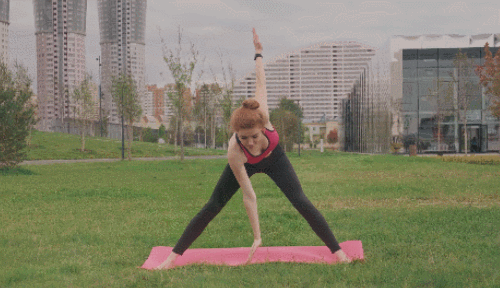 다리를 넓게 벌리고 매트에 서서 준비하세요. 그리고 팔을 옆으로 펼칩니다. 그런 다음 상체를 앞으로 숙이고, 왼손을 바닥으로 내리면서 오른손을 공중으로 들어주세요. 이번에는 왼손을 공중으로 들면서 오른손을 바닥으로 내립니다. 1분간 반복하세요.