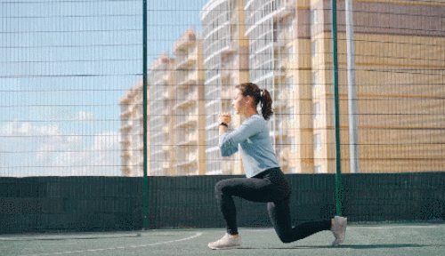 다리를 모으고 바닥에 서서 손을 가슴 앞에서 잡습니다. 그리고 오른쪽 다리를 앞으로 내딛고, 무릎을 구부리면서 런지 동작을 진행합니다. 그런 다음 왼쪽 다리를 앞으로 당겨서 런지 동작으로 연결하세요. 1분 동안 런지 동작을 반복합니다.