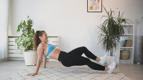 오른쪽 팔뚝으로 몸을 지탱한 상태에서 사이드 팔꿈치 플랭크 자세를 만듭니다. 그리고 왼손을 공중으로 뻗으세요. 그런 다음 손을 바닥으로 내리면서 상체를 틀어주는 동작을 30초 진행합니다. 왼쪽 팔뚝으로 지탱하는 자세로 바꿔서 30초 반복하세요.