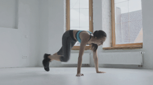 매트에 플랭크 자세로 엎드려서 준비합니다. 그리고 왼쪽 무릎을 당겼다가 되돌리면서 오른쪽 무릎을 당기는 자세로 연결하면 되는데요. 팔꿈치가 구부러지지 않도록 안정적으로 자세를 유지하고, 1분간 반복합니다.
