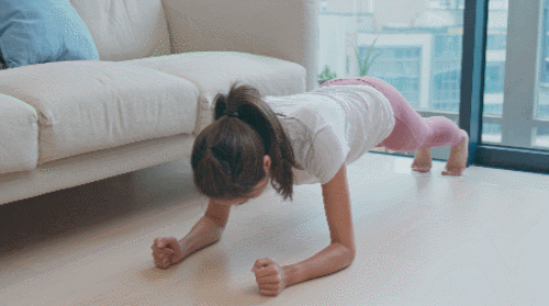바닥에 엎드려서 팔뚝으로 몸을 지탱하는 팔꿈치 플랭크 자세에서 시작합니다. 시선은 바닥을 응시하고, 몸 전체를 뻗어주면 되는데요. 어깨에서 팔꿈치로 떨어지는 라인을 직선으로 맞추세요. 1분 동안 호흡하면서 버팁니다.