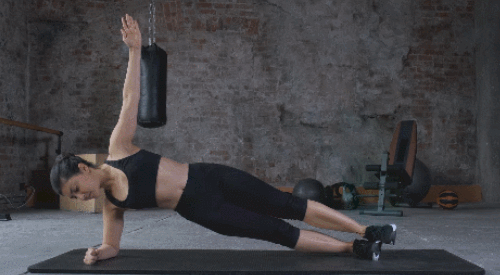 오른쪽 팔뚝을 대고 옆으로 눕습니다. 그리고 엉덩이를 들어서 자세를 만드세요. 그런 다음 왼손을 공중으로 뻗고, 왼쪽 다리를 들었다가 내리는 동작을 30초 진행합니다. 이번에는 반대편으로 돌아서 눕고, 오른쪽 다리를 드는 동작으로 30초 진행하세요.