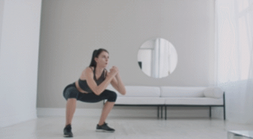다리 범위를 조절하면서 스쿼트 동작을 반복할 수 있는데요. 다리를 좁게 유지한 상태에서 스쿼트를 1회 하고, 다리를 넓게 벌린 상태로 다시 스쿼트 동작을 진행합니다. 1분 동안 운동하세요.