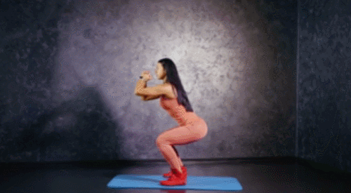 다리를 넓게 벌리고 바닥에 섭니다. 그리고 무릎을 구부리면서 엉덩이를 낮추고, 스쿼트 동작을 진행하세요. 그런 다음 일어서면서 점프 동작을 추가합니다. 다시 착지하면서 스쿼트 동작으로 연결하세요. 1분간 운동합니다.