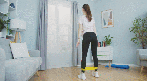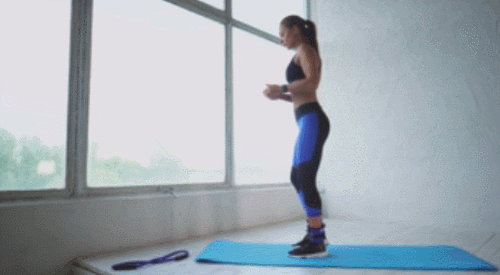 발목 사이에 탄력 밴드를 끼우고, 바닥에 서서 시작하세요. 다리는 어깨너비보다 조금 더 넓게 벌립니다. 그리고 무릎을 구부리면서 엉덩이를 내리고, 손은 앞으로 뻗어주세요. 1분 동안 스쿼트 동작을 진행합니다.
