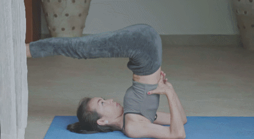 매트에 누운 상태에서 다리를 공중으로 띄우고, 머리 뒤로 완전히 넘겨주세요. 쟁기 자세를 유지하면 되는데요. 다리를 공중으로 뻗어서 어깨서기 자세로 전환합니다. 2가지 자세를 1분간 진행하세요. 손으로 허리를 지탱하면서 자세를 안정적으로 유지합니다.