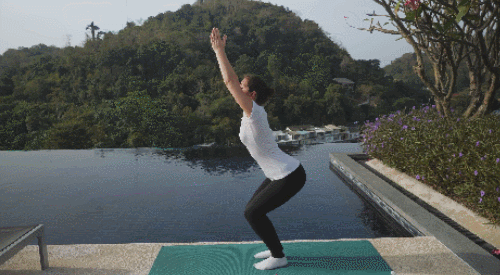 매트에 어깨너비로 다리를 벌리고 서서 준비합니다. 그리고 무릎을 살짝 구부리면서 엉덩이를 낮추고, 손을 머리 위로 뻗어서 손바닥을 붙입니다. 자세를 유지하면서 호흡하면 되는데요. 1분간 최대한 버티세요.