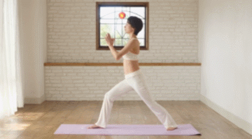 오른쪽 다리를 앞으로 뻗고, 손을 머리 위로 올려서 하이 런지 자세를 만듭니다. 그리고 팔을 옆으로 펼쳐서 워리어 자세로 전환하세요. 1분 동안 2가지 자세를 반복하면 되는데요. 무릎을 좌우로 구부리면서 운동합니다.