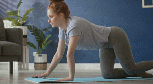 매트에 엎드려서 손과 발의 간격을 점차 좁히고, 엉덩이를 공중으로 들어줍니다. 다운도그 자세를 만들면 되는데요. 이 자세에서 무릎을 구부렸다가 펴는 동작을 추가하세요. 1분 동안 운동합니다.