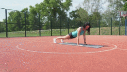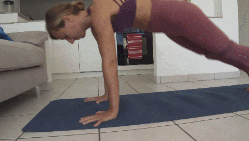 매트에 엎드려서 플랭크 자세에서 준비하세요. 그리고 하체부터 바닥으로 내리면서 팔꿈치를 구부리고, 상체를 완전히 내려줍니다. 그런 다음 원래 자세로 돌아오면 되는데요. 1분 동안 팔굽혀펴기 변형 동작을 반복합니다.