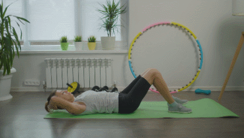 매트에 누운 상태에서 손을 머리 뒤로 보내고, 깍지 껴 잡습니다. 그리고 무릎을 세우고, 발을 바닥에 붙이세요. 그런 다음 왼쪽 무릎을 당기면서 상체를 일으켜 오른쪽 팔꿈치를 가져가세요. 이번에는 오른쪽 무릎을 당기면서 왼쪽 팔꿈치를 움직입니다. 1분간 운동하세요.