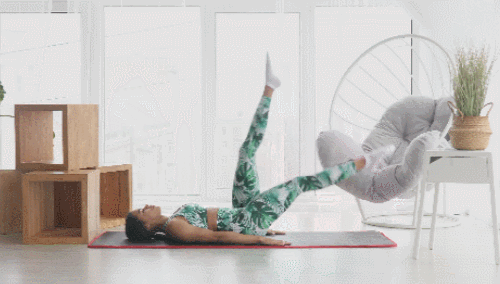 매트에 등을 대고 눕습니다. 그리고 왼쪽 다리를 당겨서 올렸다가 내려주면서 오른쪽 다리를 올려주세요. 다리를 교차하면 되는데요. 무릎을 최대한 펴고, 복부에 힘을 준 상태를 유지하면서 1분 동안 반복합니다.
