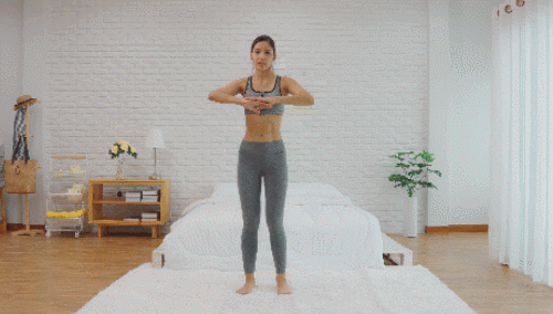 바닥에 서서 다리를 어깨너비로 벌려줍니다. 그리고 손은 가슴 앞에서 모아주세요. 그런 다음 오른쪽 무릎을 대각선 방향으로 당겨주면서 비틀었다가 왼쪽 무릎을 대각선 방향으로 당겨줍니다. 다리를 당기면서 1분 동안 운동하세요.
