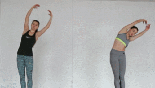 바닥에 서서 손을 머리 위로 올리고, 원 모양을 만듭니다. 그리고 상체를 시계 방향으로 움직이면서 한 바퀴 돌아줍니다. 그런 다음 반대편 방향으로 반복하세요. 1분 동안 천천히 진행합니다.
