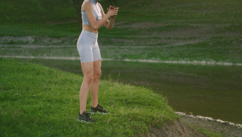 런지 동작을 앞으로 움직이면서 진행할 수 있는데요. 다리를 모으고 선 상태에서 시작합니다. 왼쪽 다리를 앞으로 뻗으면서 무릎을 구부리고, 런지 동작을 만드세요. 그리고 오른쪽 다리를 앞으로 당기면서 런지 동작으로 연결합니다. 1분간 운동하세요.