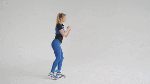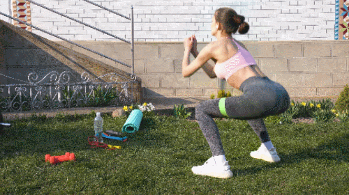 허벅지 사이에 탄력 밴드를 끼우고, 다리를 어깨너비보다 넓게 벌립니다. 그리고 무릎을 구부리면서 스쿼트를 2회 진행하세요. 손은 가슴 앞에서 잡고, 시선은 정면을 보며, 상체는 꼿꼿하게 유지합니다. 1분간 운동하세요.