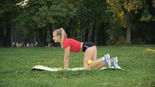 매트에 네발기기 자세로 엎드립니다. 그리고 왼쪽 다리를 90도 각도로 들었다가 내리면 되는데요. 무릎을 구부리고, 무릎 사이에 아령을 끼우면, 운동 효과를 높일 수 있습니다. 30초 운동 후, 반대편 다리로 30초 진행합니다.