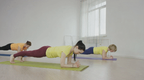 플랭크 기본자세에서 팔꿈치를 차례로 구부리면, 팔꿈치 플랭크 자세를 만들 수 있는데요. 시선은 바닥을 응시하면서 최대한 버텼다가 돌아오세요. 몸을 곧게 펴고, 코어에 힘을 주면서 1분간 자세를 유지합니다.