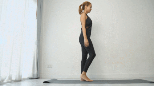 매트에 다리를 모으고 서서 시작합니다. 그리고 오른쪽 다리를 뒤로 뻗으면서 상체를 앞으로 숙여주세요. 이때 오른손으로 오른발을 잡고, 왼손은 앞으로 뻗습니다. 30초 운동 후, 반대편 방향으로 30초 반복합니다.