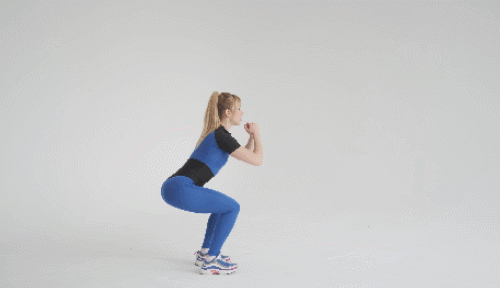 다리를 어깨너비보다 넓게 벌리고 바닥에 서서 준비하세요. 그리고 엉덩이를 바닥으로 충분히 낮추면서 손을 가슴 앞으로 모아줍니다. 다시 일어서면서 엉덩이에 힘을 주고, 원래 자세로 돌아옵니다. 1분 동안 반복하세요.