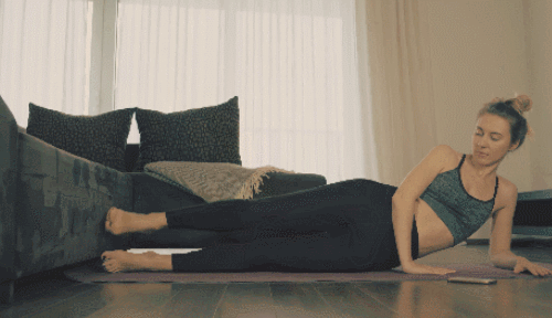 왼쪽 팔뚝을 대고 옆으로 누워서 준비하세요. 그리고 오른쪽 다리를 공중으로 들었다가 내리는 사이드 레그레이즈 동작을 30초 진행합니다. 이번에는 반대편으로 눕고, 왼쪽 다리를 드는 동작으로 30초 진행하세요.