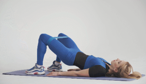 매트에 누운 상태에서 허벅지 사이에 밴드를 끼웁니다. 그리고 무릎을 세우고, 엉덩이를 들어서 브릿지 자세를 만드세요. 그런 다음 다리를 벌렸다가 모으면서 내려옵니다. 다시 엉덩이를 드는 동작과 함께 다리를 벌려주세요. 1분간 반복합니다.