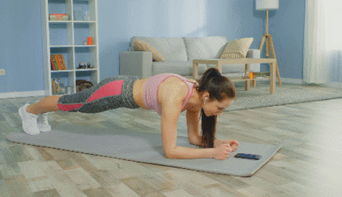 매트에 팔뚝을 대고 엎드려서 팔꿈치 플랭크 자세로 버티세요. 최대한 버틴 후, 팔꿈치를 펴고 플랭크 자세로 돌아옵니다. 이번에는 기본자세로 버티는 동작을 진행합니다. 1분 동안 2가지 자세를 번갈아 가면서 버티세요.