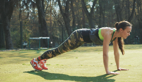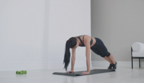 매트에 플랭크 기본자세로 엎드려서 준비하세요. 그리고 왼쪽 다리를 왼쪽으로 뻗었다가 돌아오고, 오른쪽 다리를 오른쪽 방향으로 뻗었다가 돌아옵니다. 1분 동안 다리를 움직이세요. 100개를 채우세요.