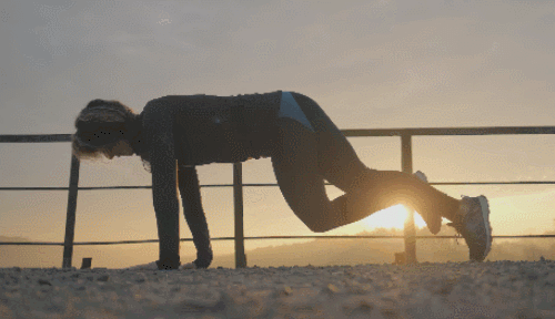 매트에 엎드려서 플랭크 자세로 준비합니다. 그리고 왼쪽 무릎을 당겼다가 되돌리고, 오른쪽 무릎을 당겼다가 되돌리면, 1회가 완료됩니다. 다리를 번갈아 빠르게 움직이면서 1분 동안 운동하세요. 시선은 바닥을 바라봅니다.