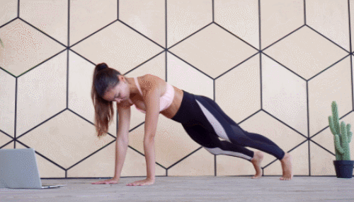 플랭크 자세로 매트에 엎드립니다. 그리고 오른쪽 다리를 왼쪽 방향으로 뻗었다가 돌아오고, 왼쪽 다리를 오른쪽 방향으로 뻗었다가 돌아옵니다. 팔꿈치는 펴고, 상체는 최대한 움직이지 않도록 자세를 유지하세요. 1분간 운동합니다.