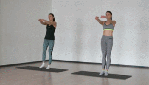 매트에 다리를 모으고 서서 시작하세요. 그리고 왼쪽 다리를 앞으로 뻗었다가 내리고, 오른쪽 다리를 앞으로 뻗었다가 내립니다. 손은 가슴 앞에서 모았다가 내리는 동작을 반복하세요. 1분 동안 운동합니다.