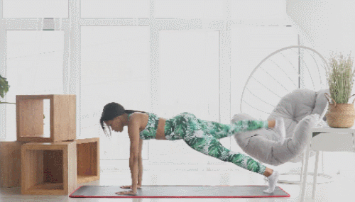 다운도그 자세에서 다리를 드는 동작을 추가할 수 있는데요. 엉덩이를 들고, 바닥에 엎드린 자세로 시작하세요. 그리고 오른쪽 다리를 공중으로 들었다가 최대한 버틴 후, 돌아옵니다. 왼쪽 다리로 반복하세요. 1분간 운동합니다.