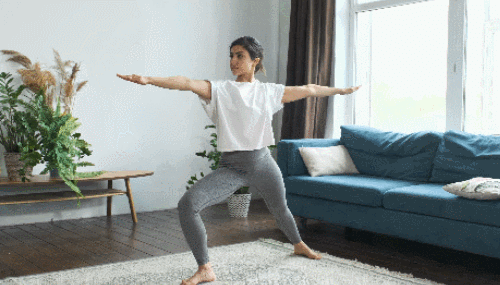 다리를 모으고 선 상태에서 왼쪽 다리를 뒤로 뻗고, 양팔을 옆으로 벌리세요. 그리고 왼쪽 무릎을 90도 각도로 구부리고, 오른쪽 다리는 펴줍니다. 시선은 왼쪽으로 향하세요. 30초 버틴 후, 다리 위치를 바꿔서 30초 진행합니다.