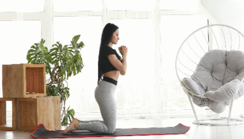 매트에 무릎을 대고 앉아서 시작합니다. 상체는 일으켜 세우세요. 손은 가슴 앞에서 모아줍니다. 그리고 다리를 당겨서 스쿼트 자세를 만들었다가 원래 자세로 돌아옵니다. 1분 동안 2가지 동작을 진행하세요.