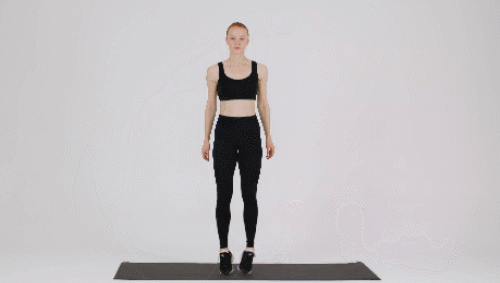 바닥에 서서 다리를 넓게 벌리세요. 그리고 스쿼트 동작을 진행합니다. 이때 손은 가슴 앞에서 모으세요. 그런 다음 원래 자세로 돌아오면서 점프 동작과 함께 다리를 모으세요. 다시 점프와 함께 다리를 벌리고, 스쿼트를 진행합니다. 1분간 진행하세요.