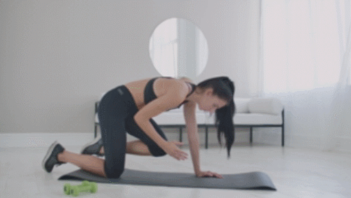 플랭크 자세로 바닥에 엎드립니다. 팔꿈치를 펴고, 시선은 바닥을 바라보세요. 그리고 오른쪽 다리를 왼쪽 팔꿈치로 당겼다가 되돌리고, 왼쪽 다리를 오른쪽 팔꿈치로 당겼다가 되돌립니다. 1분 동안 반복하세요.