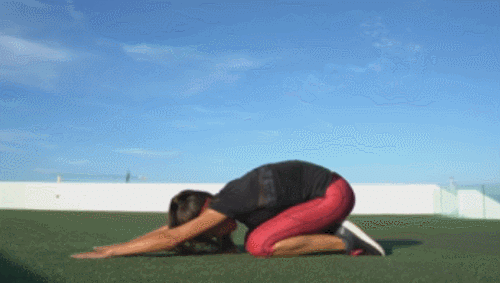 매트에 무릎을 꿇고 앉으세요. 상체를 앞으로 숙입니다. 손끝을 뻗고, 엉덩이는 발꿈치에 붙이세요. 그리고 상체를 일으키면서 엉덩이를 내리고, 코브라 자세로 전환합니다. 1분 동안 2가지 동작을 반복하세요.