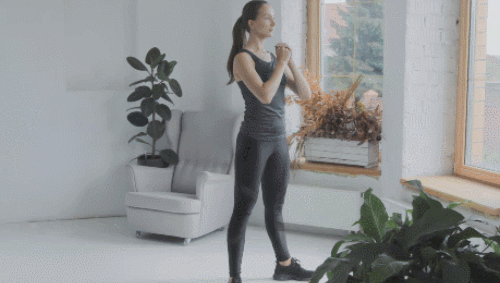 어깨너비보다 넓게 다리를 벌리고 서서 준비합니다. 손은 가슴 앞에서 모으세요. 무릎을 구부리면서 엉덩이를 최대한 내렸다가 올려줍니다. 풀 스쿼트 자세를 1분 동안 반복합니다. 시선은 정면을 보고, 상체는 세워줍니다.
