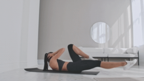 매트에 눕고 손은 머리 옆으로 옮깁니다. 다리는 공중으로 띄우세요. 그리고 왼쪽 무릎을 당기면서 상체를 틀었다가 오른쪽 무릎을 당기면서 상체를 틀어주세요. 1분 동안 바이시클 크런치 동작을 진행합니다.