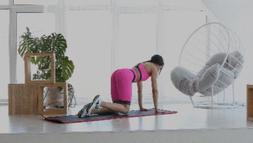 매트에 네발기기 자세로 엎드리세요. 밴드를 활용하면, 운동 효과를 높일 수 있습니다. 오른쪽 다리를 오른쪽 방향으로 들었다가 내리면서 30초 운동하세요. 이번에는 왼쪽 다리로 30초 반복합니다.