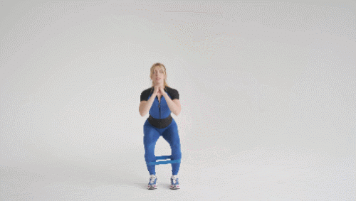 다리를 모으고 바닥에 서서 시작하세요. 시선은 정면을 바라보고, 손은 가슴 앞에서 붙입니다. 그리고 왼쪽 방향으로 다리를 벌리면서 스쿼트를 진행하고 돌아오고, 오른쪽 방향으로 반복합니다. 1분 동안 운동하세요.