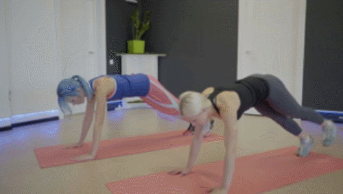플랭크 기본자세로 엎드리고, 시선은 바닥을 응시합니다. 그리고 오른발을 공중으로 들었다가 내리고, 왼발을 공중으로 들었다가 내립니다. 1분 동안 번갈아 움직이면 되는데요. 엉덩이의 자극을 느끼면서 운동하세요.