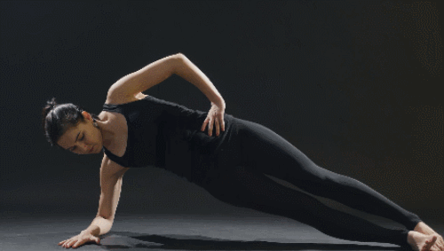 오른쪽 팔뚝을 대고 옆으로 누워서 사이드 팔꿈치 플랭크 자세를 만듭니다. 그리고 엉덩이를 바닥으로 내렸다가 들면서 업다운 동작을 30초 진행하세요. 반대편으로 돌아서 눕고, 30초 진행합니다.