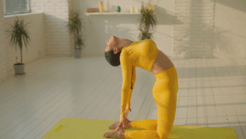 매트에 무릎을 꿇고 앉아서 상체를 일으킵니다. 그리고 상체를 뒤로 젖히면서 손으로 발꿈치를 잡거나 발목을 잡아주세요. 자세를 유지하면서 호흡합니다. 1분 동안 반복하세요. 차일드 자세로 스트레칭합니다.