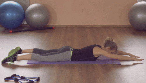 매트에 엎드린 상태에서 팔을 앞으로 뻗어줍니다. 그리고 상체를 최대한 들었다가 내리는 동작을 진행하면 되는데요. 몸을 최대한 늘여주고, 1분 동안 상체 들기 동작을 반복합니다. 다리는 바닥에 붙이세요.