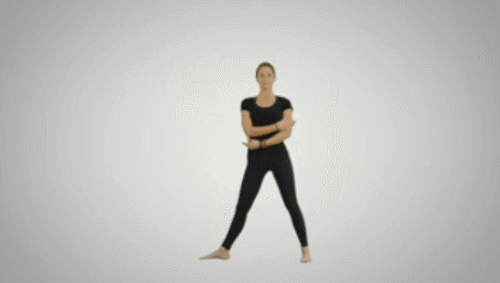 어깨너비보다 다리는 넓게 벌리고 서서 시작하세요. 오른발을 틀어주고, 오른손을 바닥으로 내리면서 상체를 숙이세요. 왼손은 공중으로 뻗어줍니다. 이번에는 반대편 방향으로 반복하세요. 1분 동안 운동합니다.