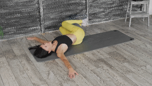 매트에 누운 상태로 팔은 옆으로 펼칩니다. 그리고 다리는 들고, 무릎은 90도로 구부립니다. 그런 다음 왼쪽으로 무릎을 넘겼다가 돌아오고, 오른쪽으로 넘겼다가 돌아옵니다. 1분 동안 반복하세요.