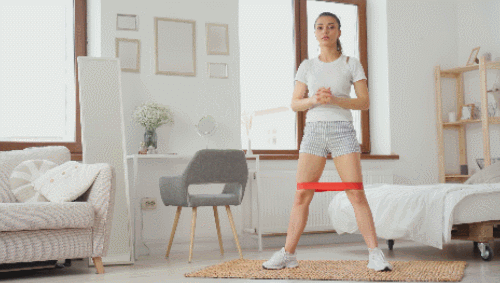 다리는 어깨너비보다 넓게 충분히 벌립니다. 다리 사이에 밴드를 착용하여 운동 효과를 높이세요. 무릎을 구부리면서 스쿼트 동작을 진행합니다. 손은 가슴 앞에서 잡아서 반복하세요. 시선은 정면을 바라봅니다. 1분 동안 운동하세요.